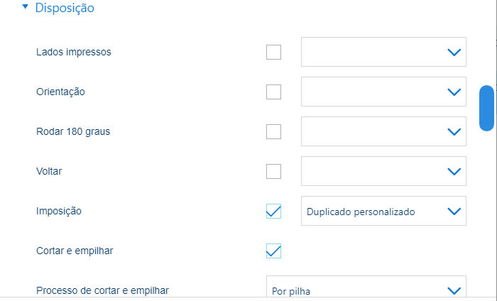 Utilize esta definição para indicar se pretende cortar e empilhar as folhas. |