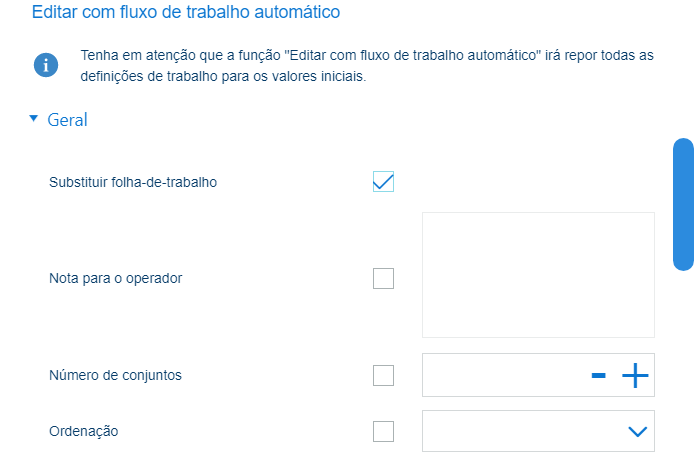 Está presente uma definição para substituir a folha de trabalho. Esta definição está ativada por predefinição. Isto significa que as definições da função [Editar com fluxo de trabalho automático] terão prioridade. Por exemplo: