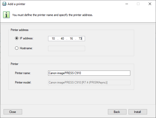 Digitare l'indirizzo IP e il nome della stampante. La stampante verrà aggiunta con questo nome a PRISMAprepare.