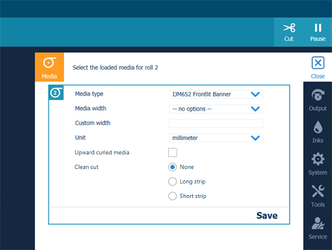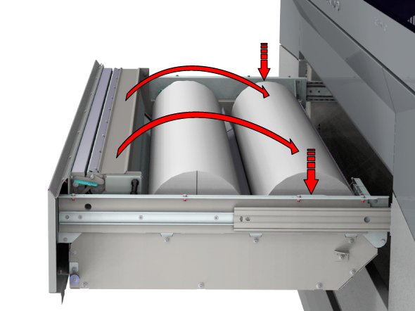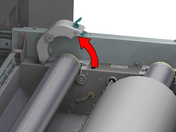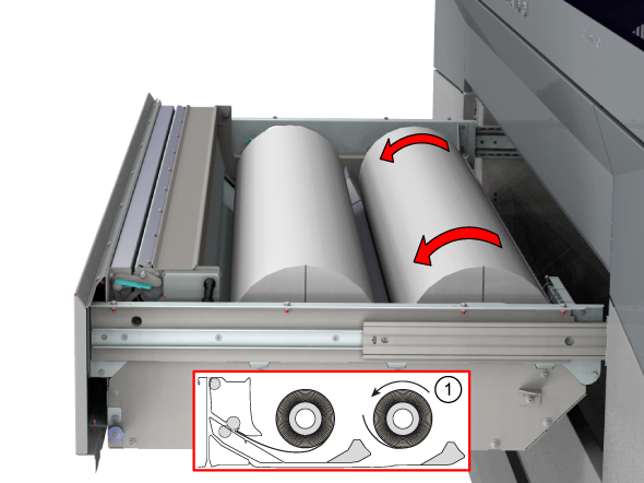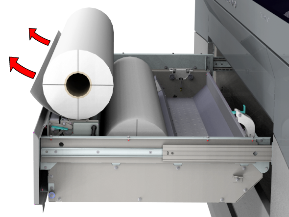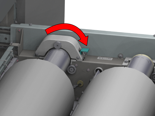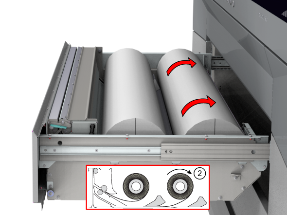 只要分配了紙張,此設定就會保留。若啟用此選項,系統會將紙張送入輸出位置。然後,您可以打開上蓋並引導紙張。關閉上蓋後,紙張會輸送到滾筒夾。打開上蓋並再次引導紙張。完成這些操作後,便會開始列印。