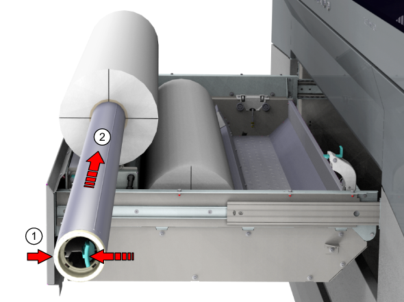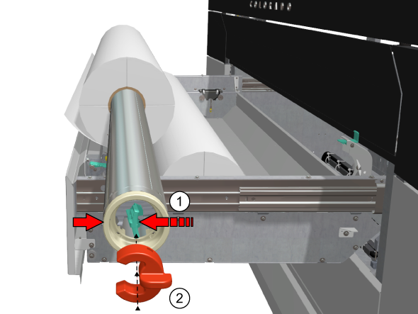 將紙軸(2)推到新紙張滾筒筒芯的那一側。