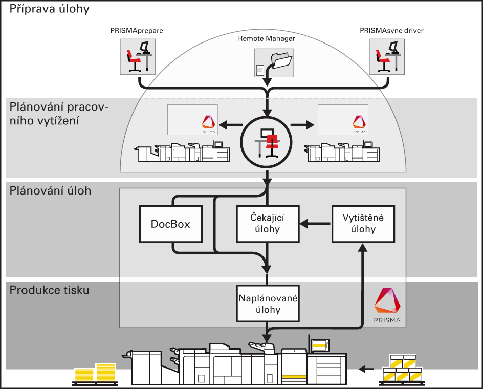 Následující obrázek znázorňuje postup zpracování úlohy tisku dokumentů od přípravy úlohy po doručení výtisků.