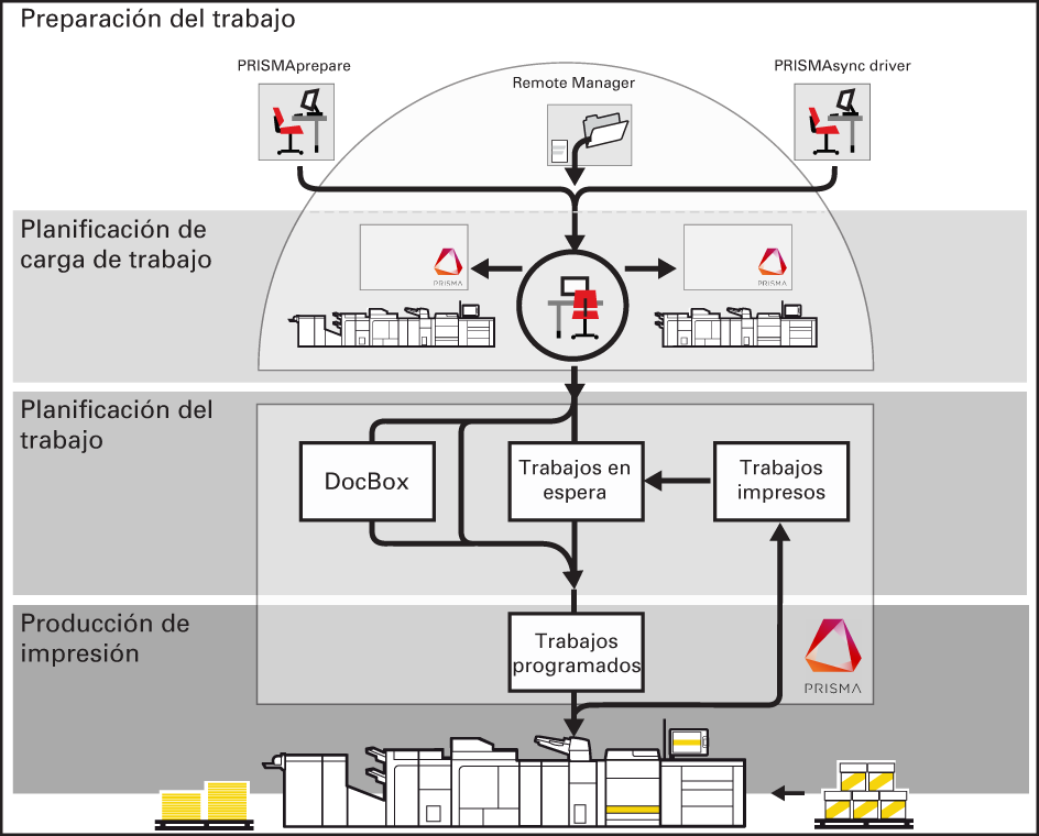 En la ilustración siguiente se muestra el flujo de trabajo de impresión de documentos desde la preparación de trabajos hasta la entrega de las copias.