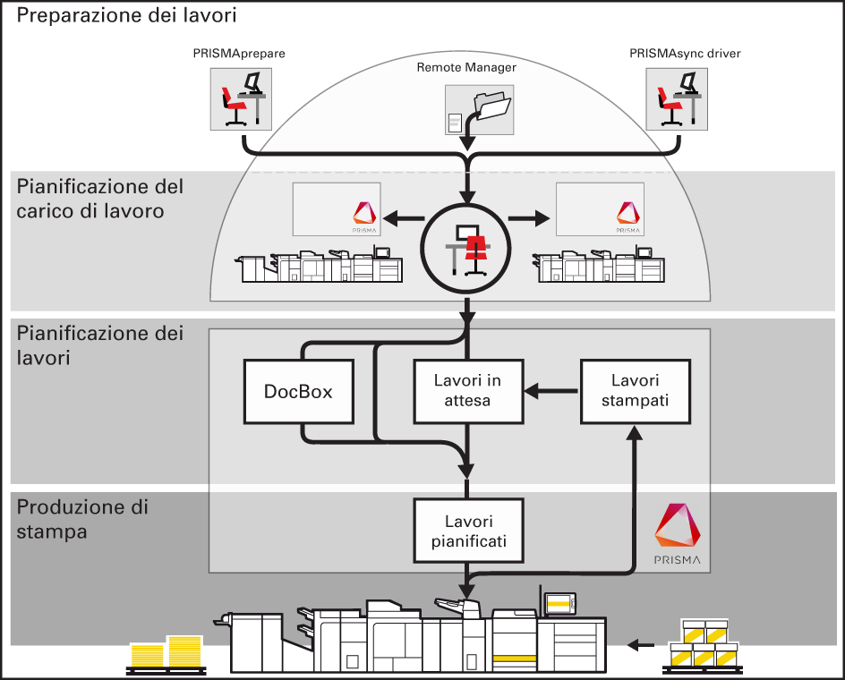 Le seguenti istruzioni illustrano il flusso di lavoro dei lavori di stampa dei documenti dalla preparazione del lavoro alla distribuzione delle stampe.