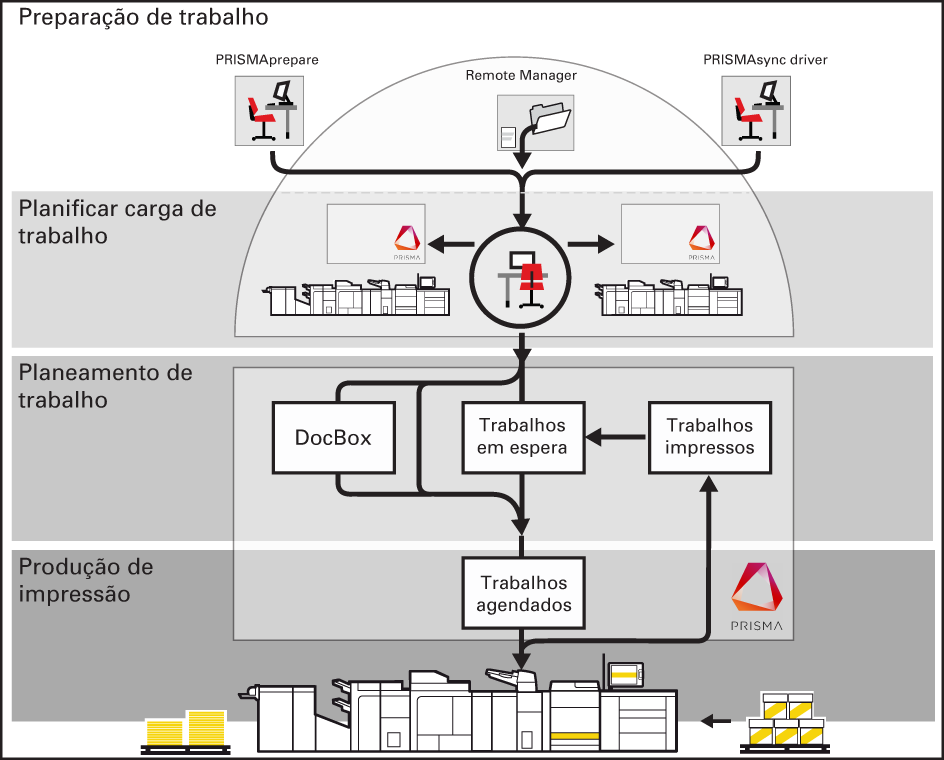 A seguinte ilustração mostra o fluxo de trabalhos de impressão de documentos, da preparação de trabalhos à saída das impressões.