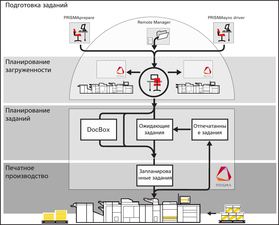На следующей иллюстрации показан рабочий процесс задания печати документа — от подготовки задания до выгрузки отпечатков.