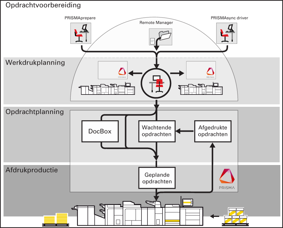 In de volgende afbeelding wordt de opdrachtworkflow voor het afdrukken van documenten, vanaf de voorbereiding van de opdracht tot de aflevering van de afdrukken, weergegeven.