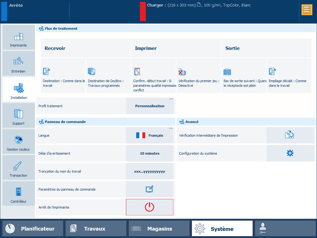 Une vérification intermédiaire de l'impression consiste en l'impression d'un exemple de feuille de travail. Vous pouvez utiliser ces feuilles pour vérifier la qualité de l’impression. Les impressions test intermédiaires sont imprimées selon un intervalle défini, mais peuvent aussi être imprimées sur demande.