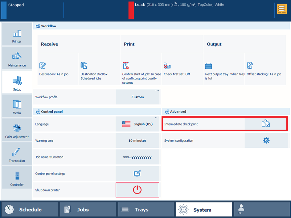 [Basic] settingsUse the [Interval of intermediate check print] setting to define the interval of intermediate check prints. The printing of intermediate check prints is disabled when the value is: 0.
