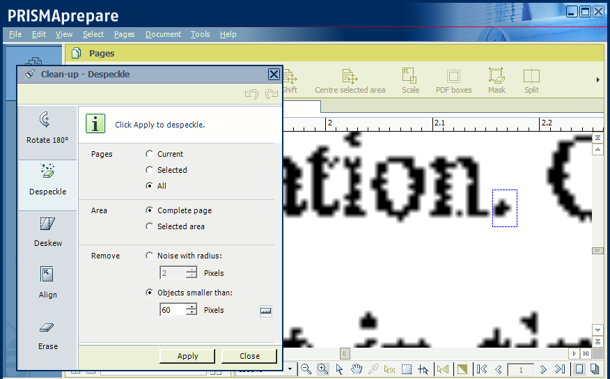 Move the cursor to the preview and draw a box around the dot. In the [Clean-up] dialogue, the [Pixels] box displays a number. This is the amount of pixels that form the dot, in this case: 60 pixels.