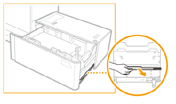 Retire o suporte de fixação para folhas longas do lado direito da bandeja para conjuntos de materiais. |