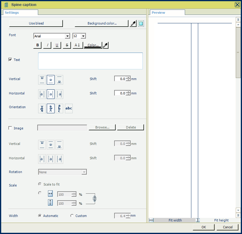 Create your own spine caption. Type a text for the spine, select a font, a background colour, etc.