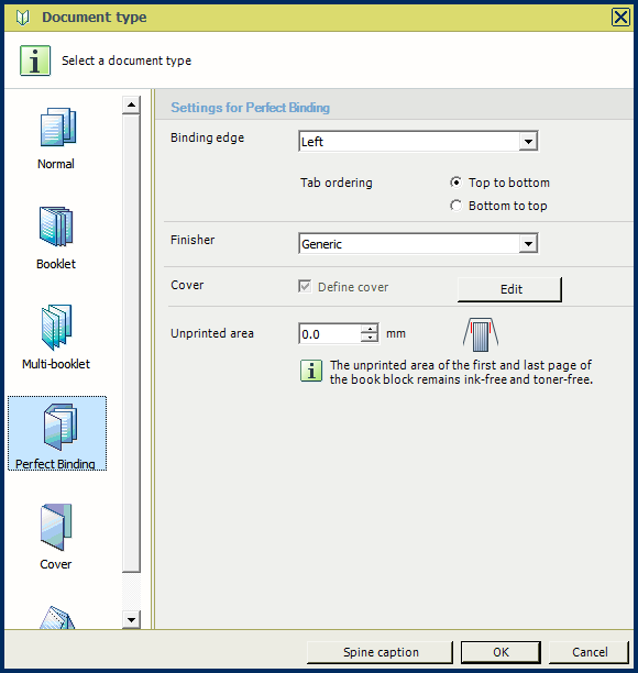 Position the cursor to the spine area beside the first page and double click it. The [Spine caption] dialogue opens.