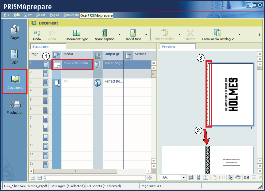 Click [OK]. In the preview, the document with perfect binding is visible with a crossed spine. The media assigned to the cover pages is changed into a media with a larger size: two times the page size plus the width of the spine: 426.4 x 297 mm.