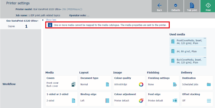 Nu kan PRISMAdirect også hente mediekataloget fra printeren. PRISMAdirect sammenligner de medier, der er brugt i dokumentet, med printerens mediekatalog. Når det er muligt, knyttes mediet i dokumentet automatisk til mediet på printeren. Du skal tilknytte mediet manuelt, hvis den automatiske medietilknytning ikke er korrekt eller mulig. Se enten proceduren "Tilknyt mediet manuelt i PRISMAdirect" eller proceduren "Tilknyt mediet manuelt på Fiery-printserveren" nedenfor.