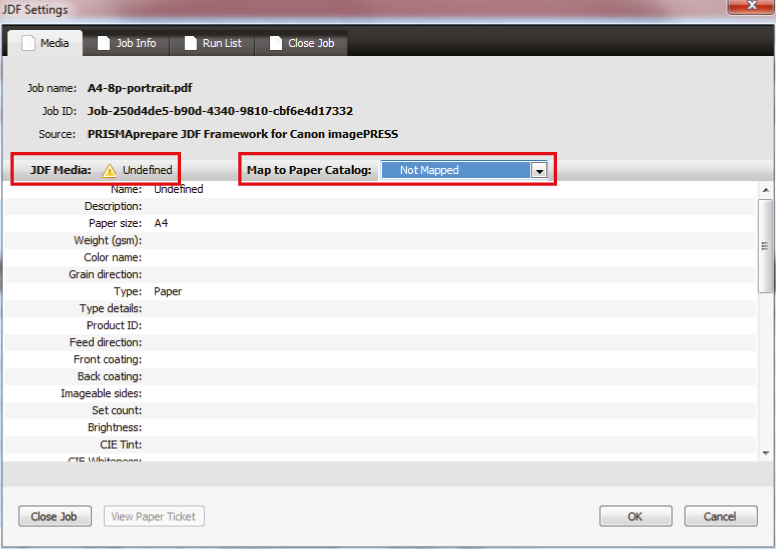 Mediet er ikke tilgængelig i papirkataloget: "JDF-medier: Udefineret".