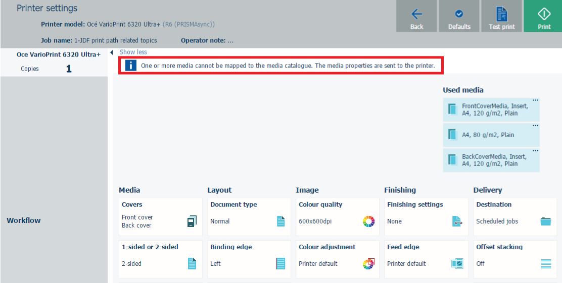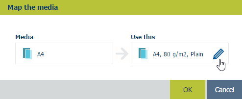 Aplikace PRISMAdirect nyní může katalog médií stáhnout z tiskárny. Aplikace PRISMAdirect porovná média použitá v dokumentu s katalogem médií z tiskárny. Pokud je to možné, média v dokumentu budou automaticky mapována na média, která má tiskárna k dispozici. Pokud automatické mapování není správné nebo ho nelze provést, je nutné média namapovat ručně. Seznamte se s níže uvedeným postupem Ruční mapování médií v aplikaci PRISMAdirect nebo s postupem Ruční mapování médií na serveru Fiery Print Server.