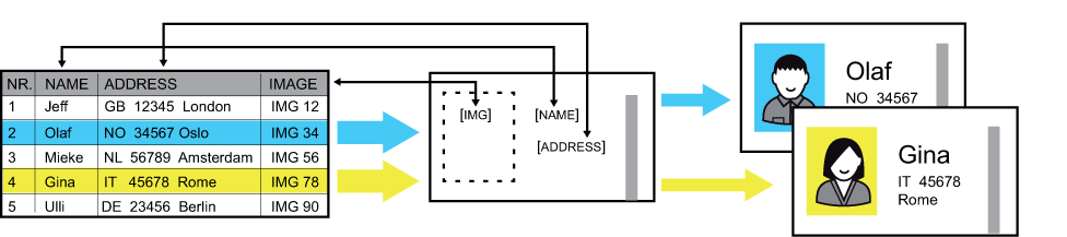 Drukowanie danych zmiennych ma zastosowanie w marketingu bezpośrednim, reklamie i spersonalizowanych pismach. Program PRISMAprepare i narzędzia do tworzenia dokumentów umożliwiają tworzenie spersonalizowanych dokumentów. Zmienne dane, na przykład nazwiska i adresy, są łączone ze stałymi elementami i zapisywane jako dokumenty z wieloma rekordami.
