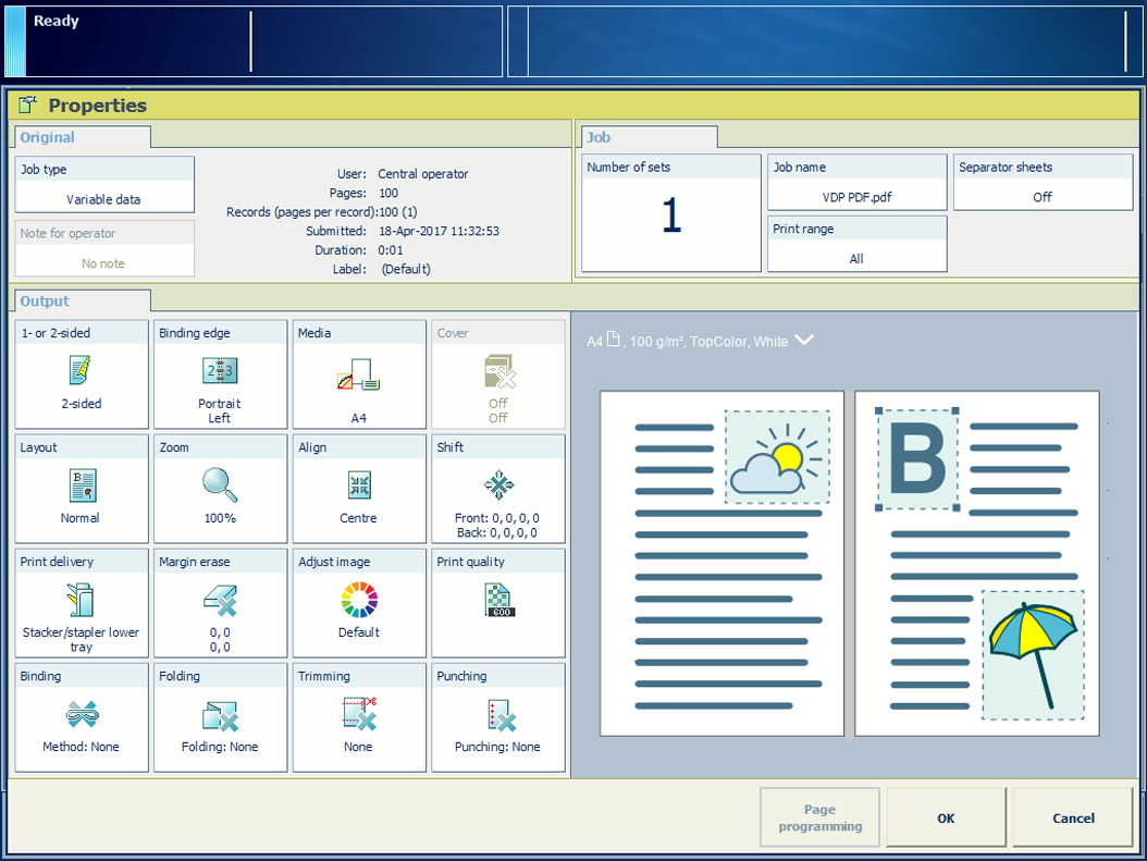 Obsługiwane są także ręcznie utworzone zadania VDP. Jeśli PRISMAsync otrzyma zadanie ze zmiennymi danymi, identyfikuje strukturę rekordów. Rekordy są traktowane jako zestawy wydruków. Prześlij zadania ze zmiennymi danymi do PRISMAsync za pomocą PRISMApreparelub automatycznego przepływu pracy.