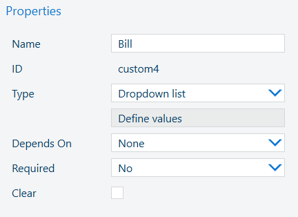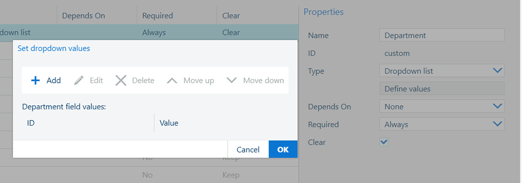 Valitse kohdasta [Tyyppi] valinta [Pudotusvalikko] ja valitse sitten [Riippuu seuraavasta:] ja [custom]. Tämä tarkoittaa, että projektin nimi riippuu sitä ennen valitusta osastosta.