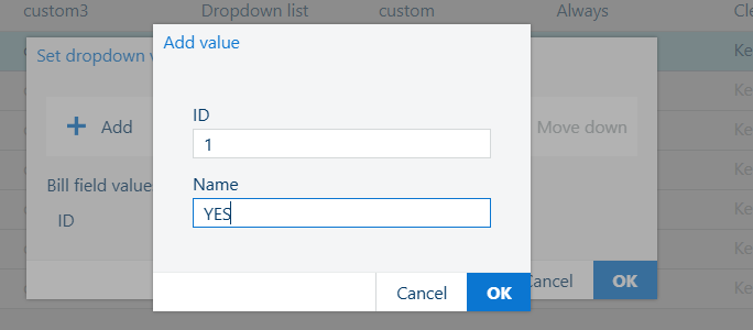 3. Em Tipo, selecione[Lista suspensa] e, em seguida, selecione [Definir valores] uma caixa de diálogo é aberta - isto permite-lhe criar os valores para Faturação