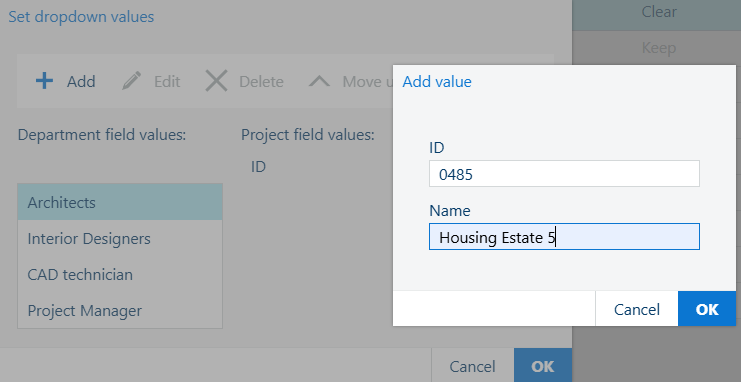 Dette skal du gøre for hver Afdeling-feltværdi. Vælg derfor den næste Afdeling-feltværdi, og udfør trin 5-8 igen, indtil alle projekter er tilføjet, og hver Afdeling-feltværdi har samme liste over projekter