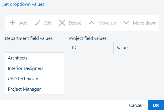At [Type], select [Dropdown list] and then select [Depends on] and select [custom]. This means that the project name is dependent on the department being selected first.