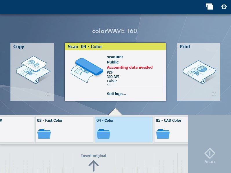 Abra el dispositivo colorWAVE/plotWAVE registrado y prepare un nuevo trabajo de impresión. Seleccione la operación deseada en el panel de control de la impresora: