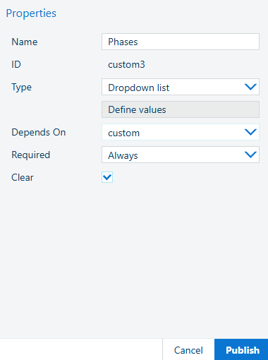 Seleccione [Depende de], y en la lista desplegable, seleccione [custom]. Esto significa que la fase depende del departamento que se va a seleccionar primero.