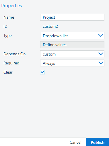 En [Tipo], seleccione, [Lista desplegable] y, a continuación, seleccione [Depende de] y seleccione [custom]. Esto significa que el nombre del proyecto depende del departamento que se va a seleccionar primero.