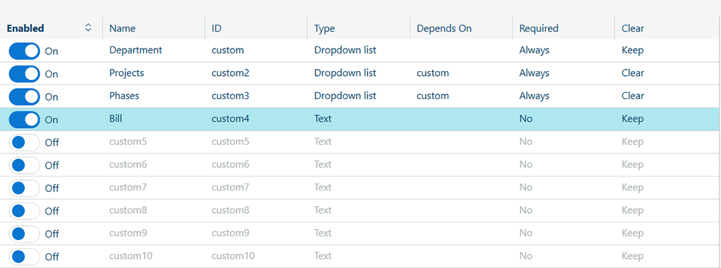 フィールド1 ("Department") - どの部署に対して請求するかを追加します。