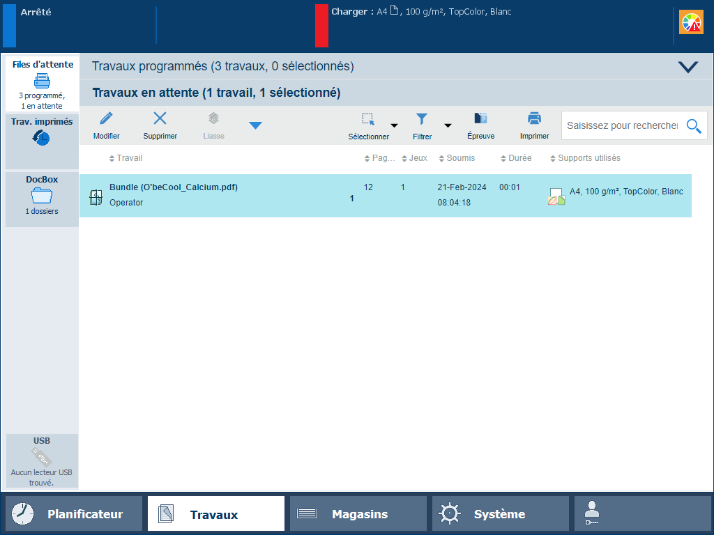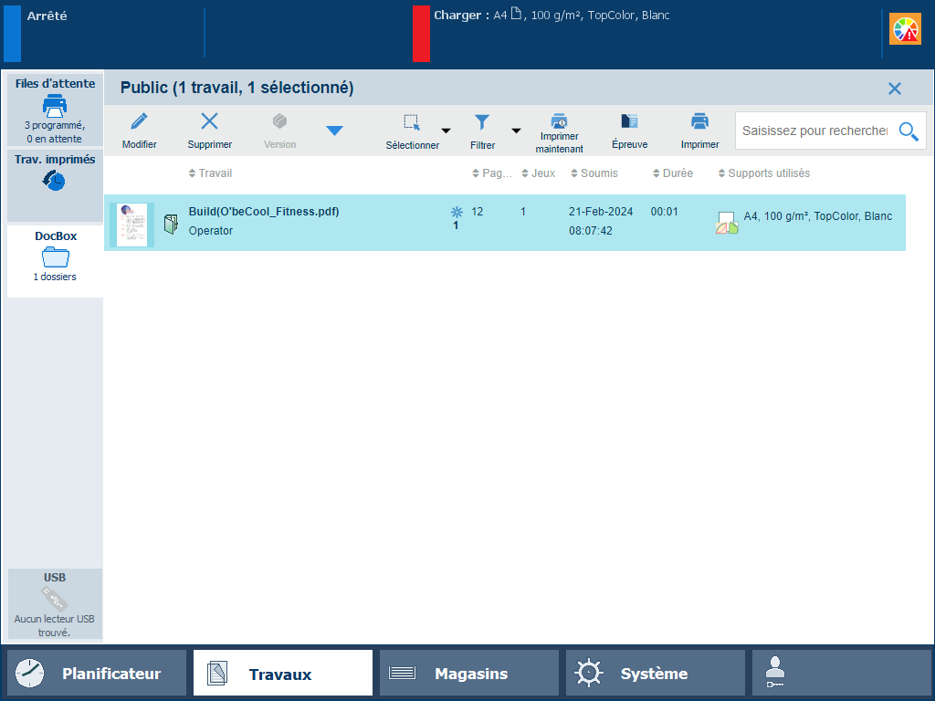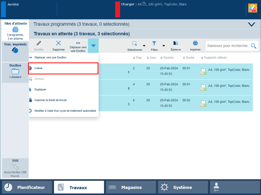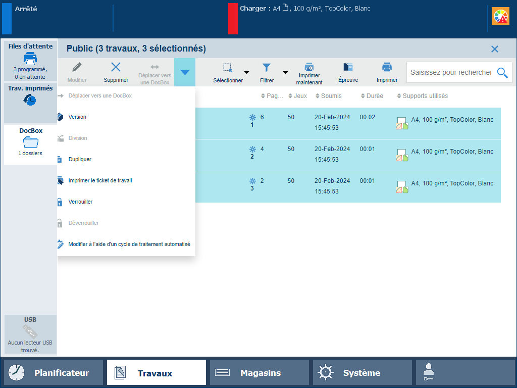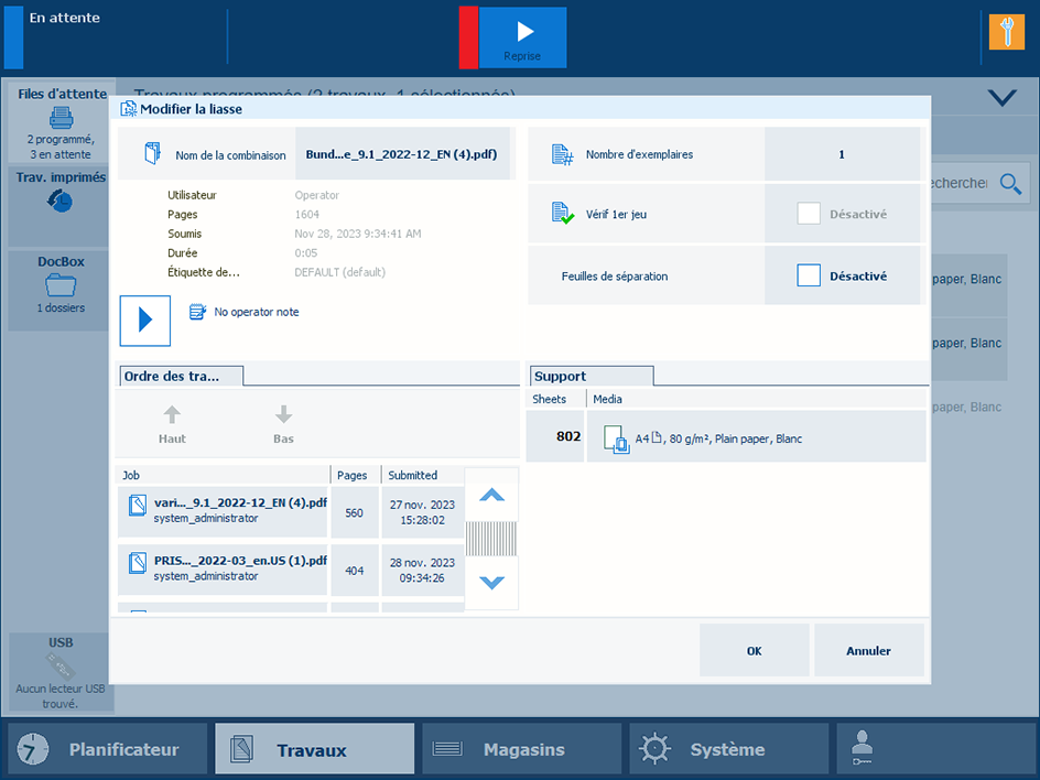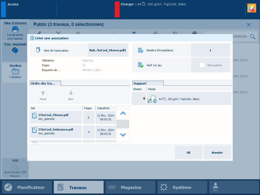 Pour augmenter la productivité d'impression, vous pouvez combiner plusieurs travaux DocBox ou en attente au sein d'un travail unique. Vous pouvez modifier certaines propriétés du travail combiné et de la commande de travail.