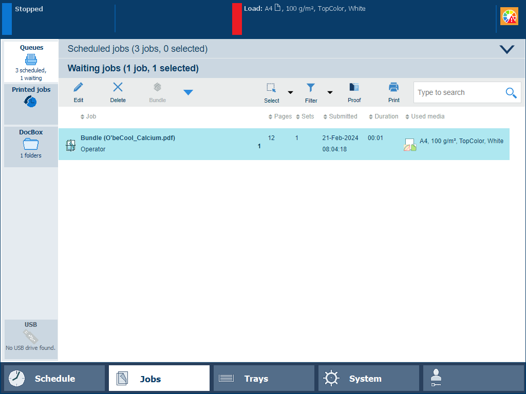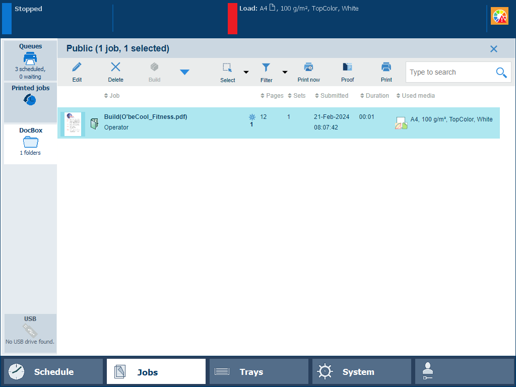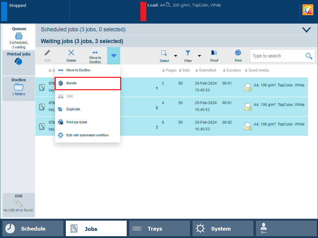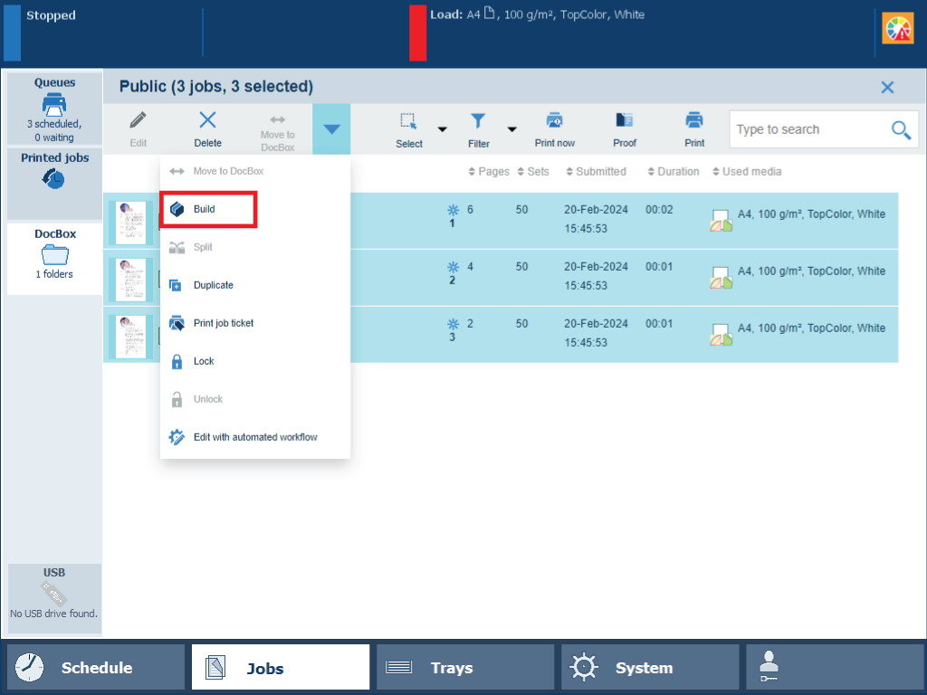 To increase the print productivity, you can combine several waiting jobs or DocBox jobs into a single job. You can change some properties of the combined job and the job order.