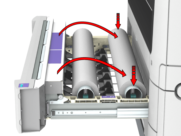 Af hensyn til ryggen anbefales det at isætte en medierulle i størrelsen A0 eller E i position 1 og en medierulle i størrelsen A2 eller C i position 2.