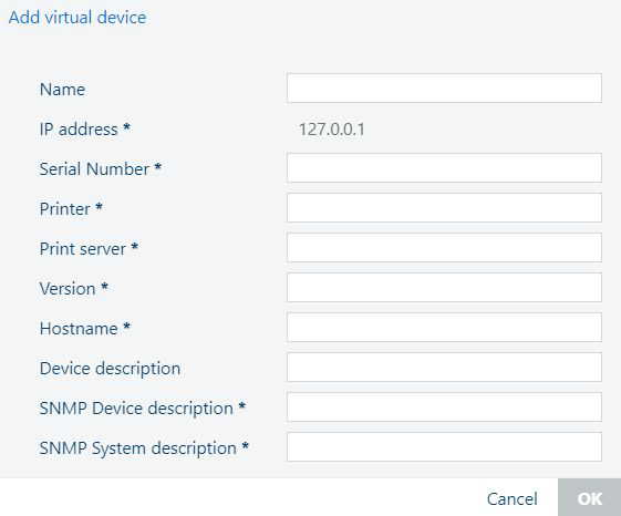 [가상 장치 추가] 은(는) 실제 장치를 사용할 수 없을 때 데모용 솔루션입니다.가상 장치를 사용할 때의 이점은 즉각 사용할 수 있으며 연결 부재 문제가 없다는 것입니다.[장치] 테이블의 모든 필드에 값을 입력해야 합니다.