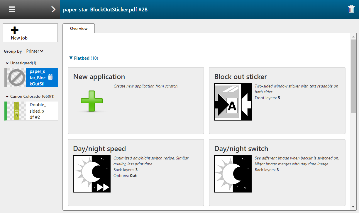 ONYX Thrive で印刷ジョブを開くと、ジョブを割り当てたプリンタ タイプのレシピのみが表示されます。