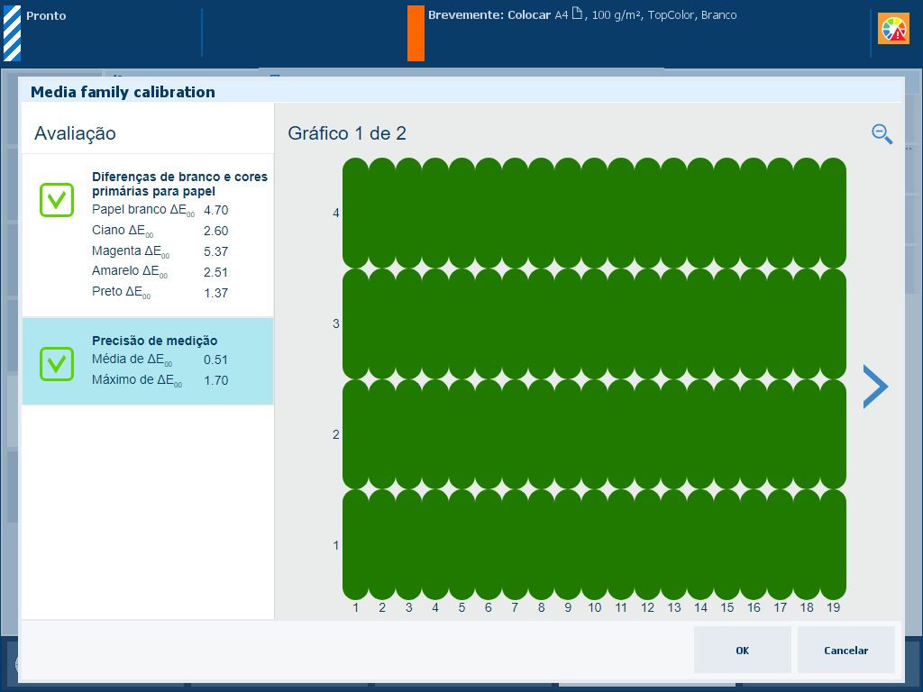 Janela de resposta do procedimento de calibragem da família de materiaisQuando vir dois ícones de marca de verificação verdes, toque em [OK] para guardar as novas curvas de calibragem.