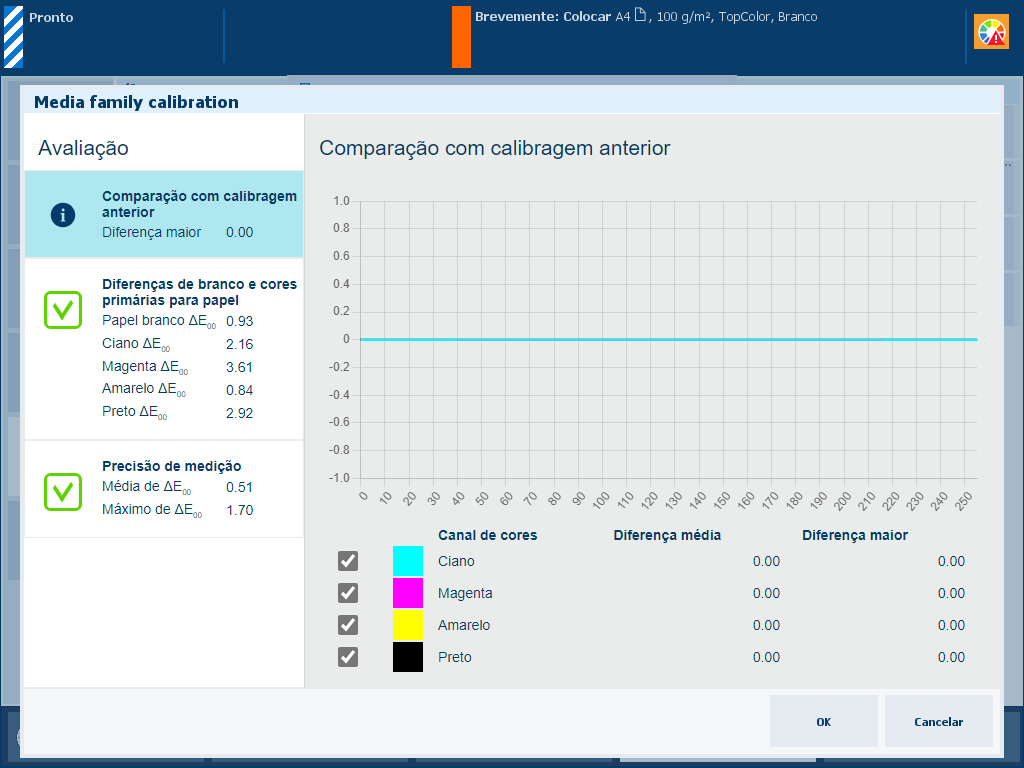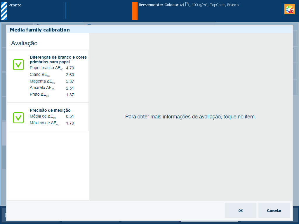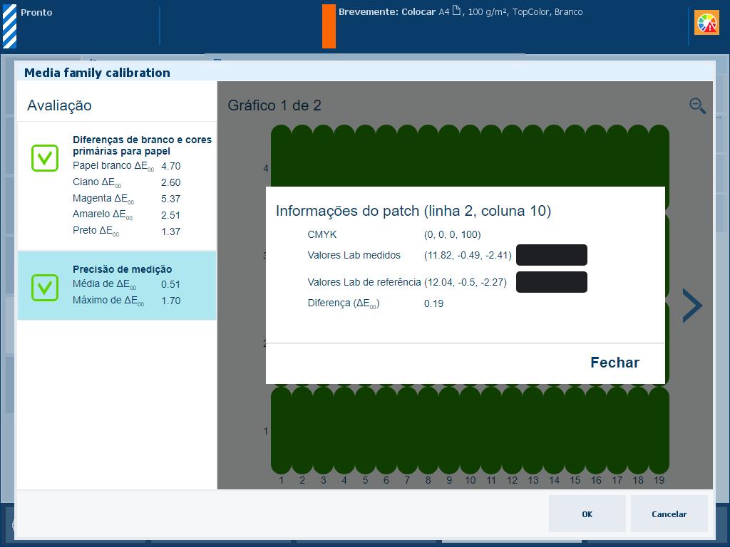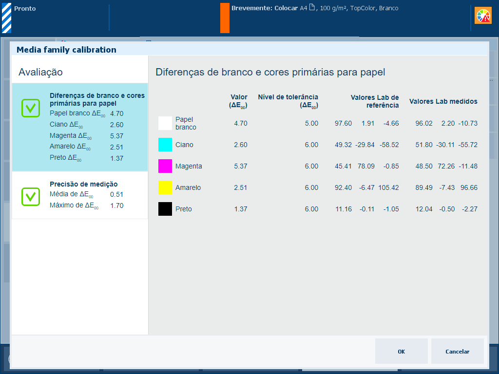 Descrição Os valores ΔE das informações [Diferenças de branco e cores primárias para papel] são indicadores da diferença entre os valores de referência e valores medidos. Os [Valores Lab de referência] são obtidos durante a primeira calibragem da família de materiais. |