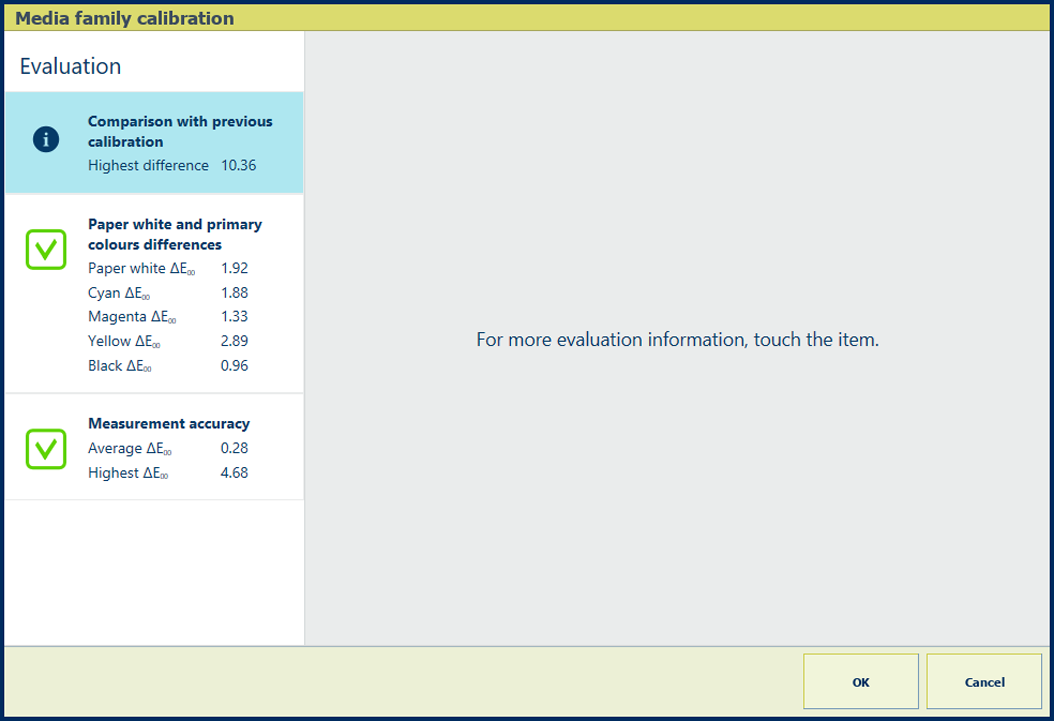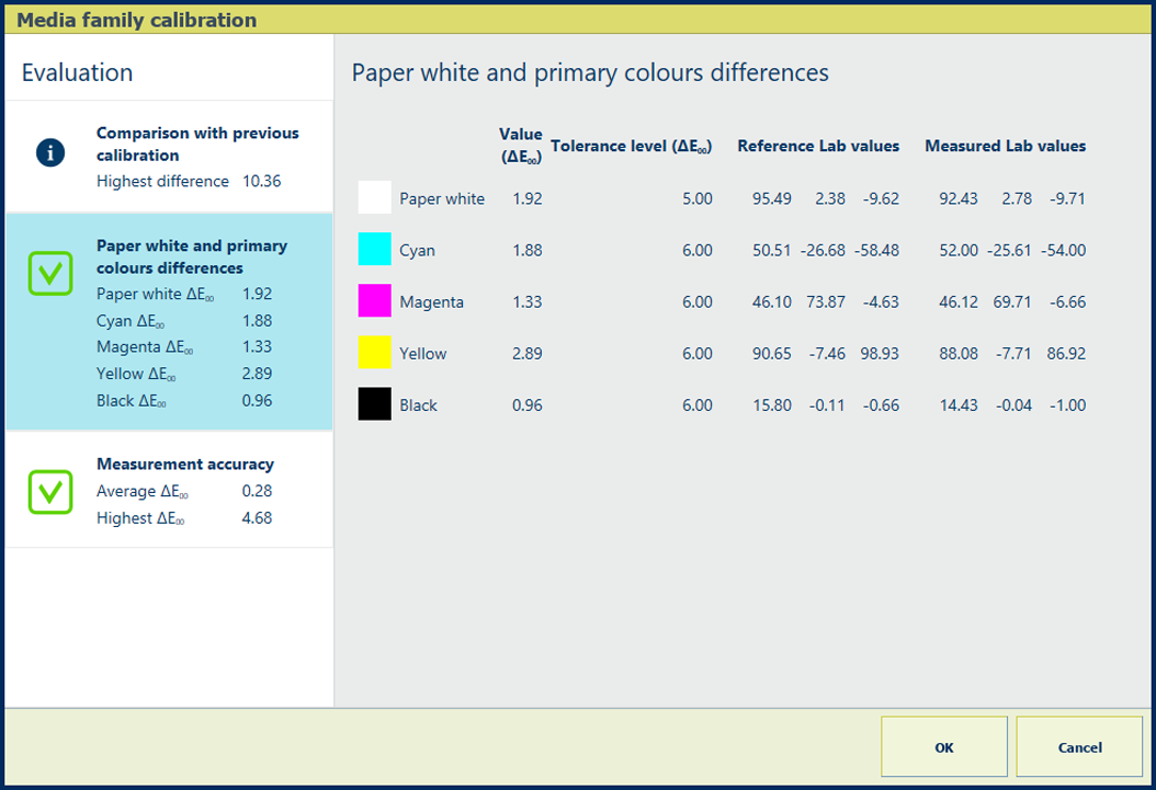 Description Les valeurs ΔE des informations [Différences du blanc et des couleurs primaires du papier] sont des indicateurs de la différence entre les valeurs de référence et les valeurs mesurées. Les [Valeurs Lab de référence] sont prises lors du premier étalonnage de la famille de supports. |