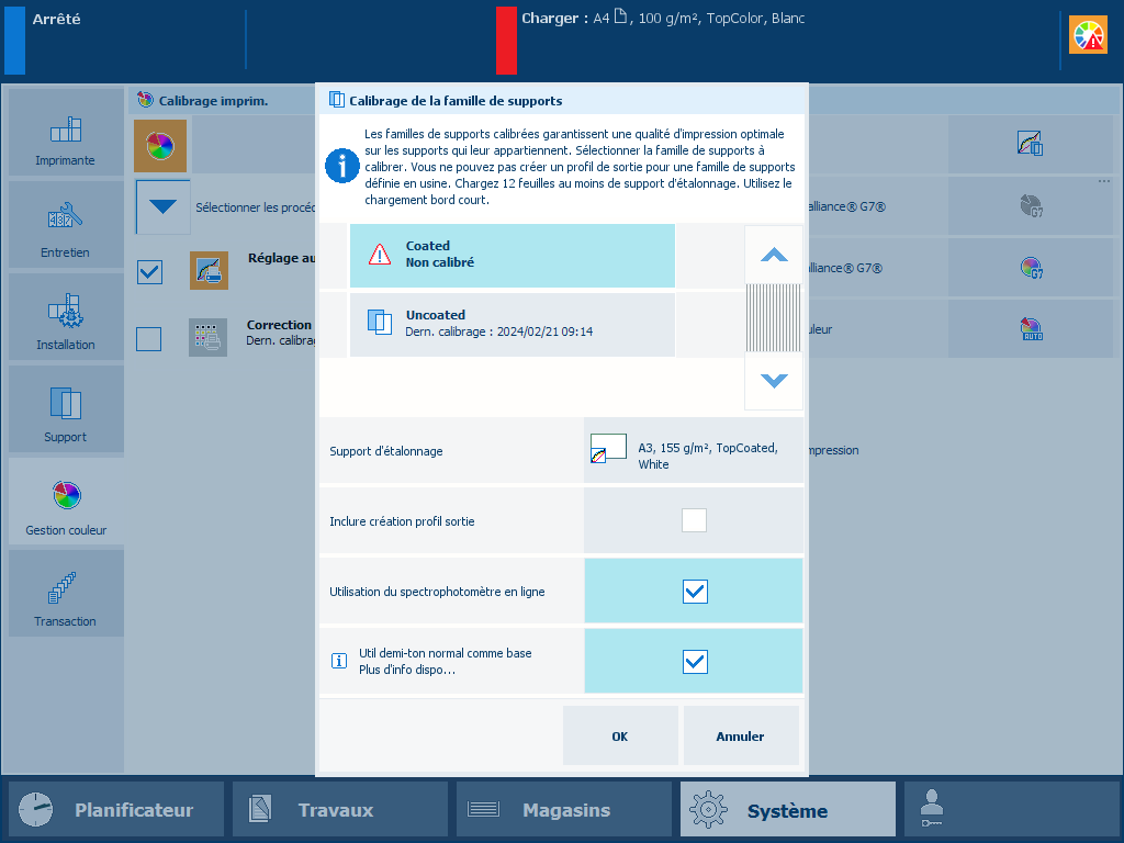 3. Toucher [Système]  → [Gestion couleur]  → [Calibrer famille supports].