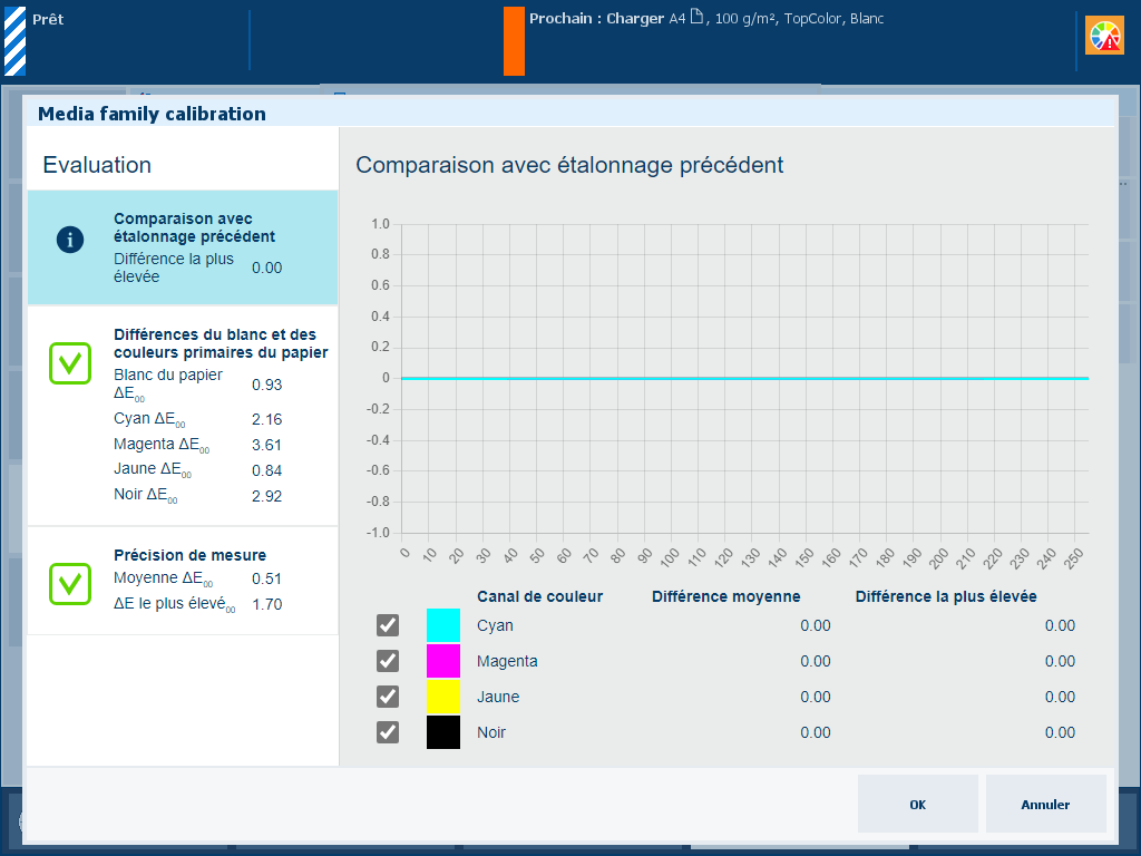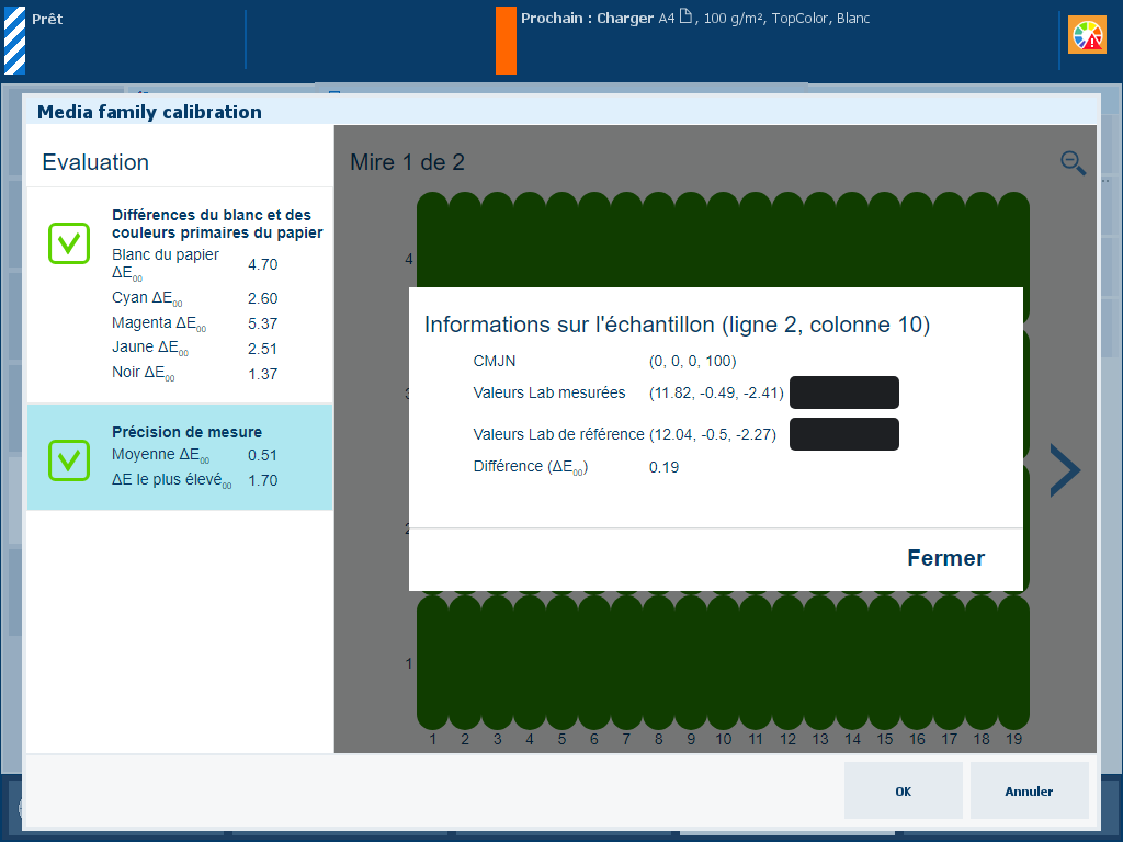 Les valeurs [Différence la plus élevée] et [Différence moyenne] des informations [Comparaison avec étalonnage précédent] sont des indicateurs de la fréquence de l’étalonnage de la famille de supports.