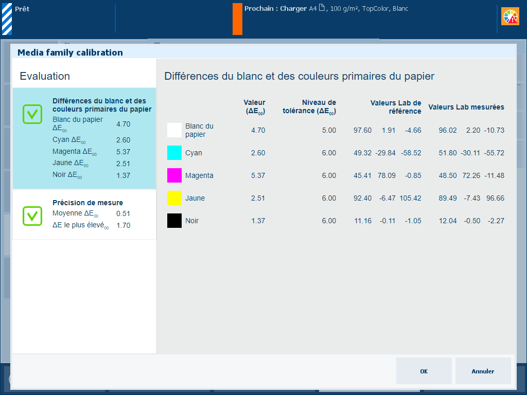 Les valeurs ΔE des informations [Différences du blanc et des couleurs primaires du papier] sont des indicateurs de la différence entre les valeurs de référence et les valeurs mesurées.