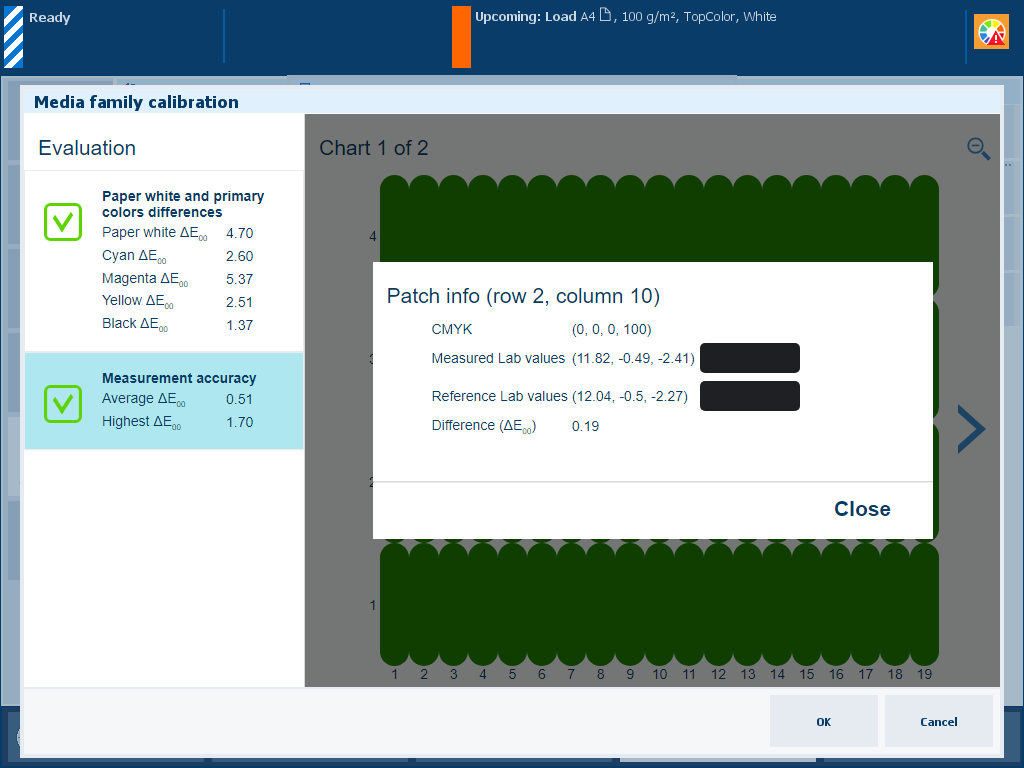 Then, touch the red patch to find the row and column number to check the corresponding patch on the printed chart to solve the problem. Then, calibrate the media family again.