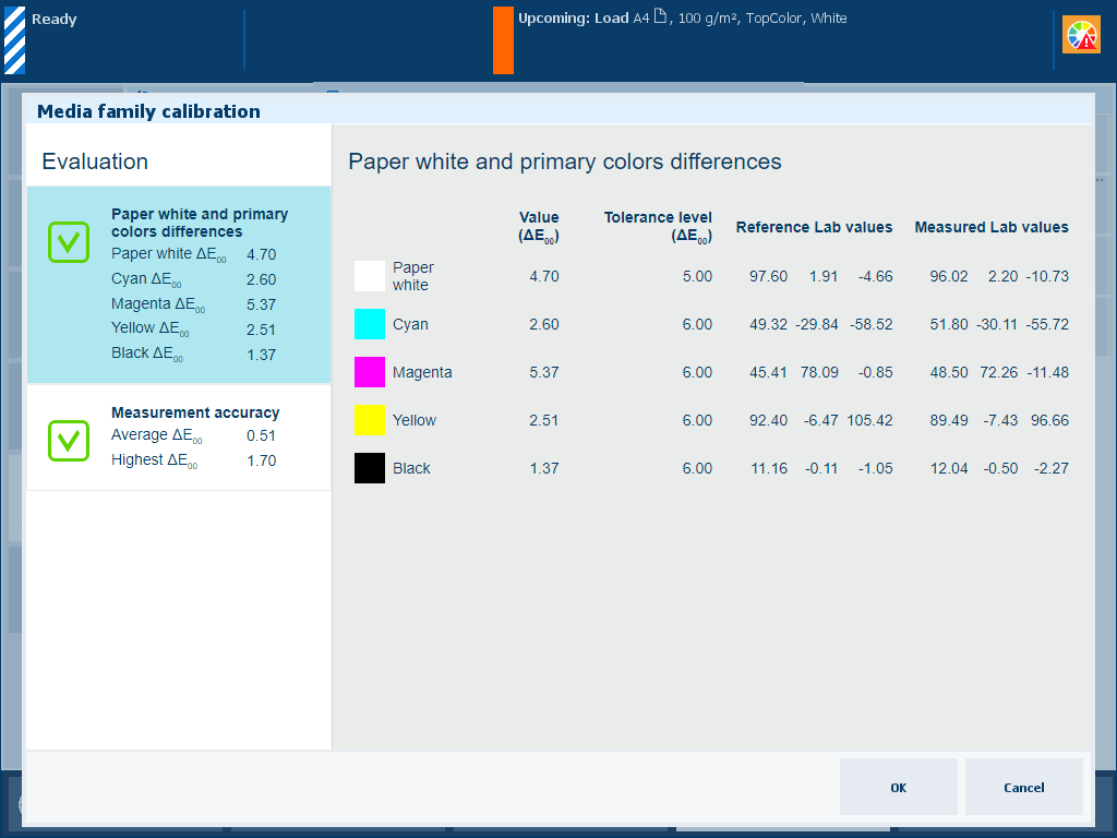 The ΔE values of the [Paper white and primary colors differences] information are indicators for the difference between the reference values and measured values.