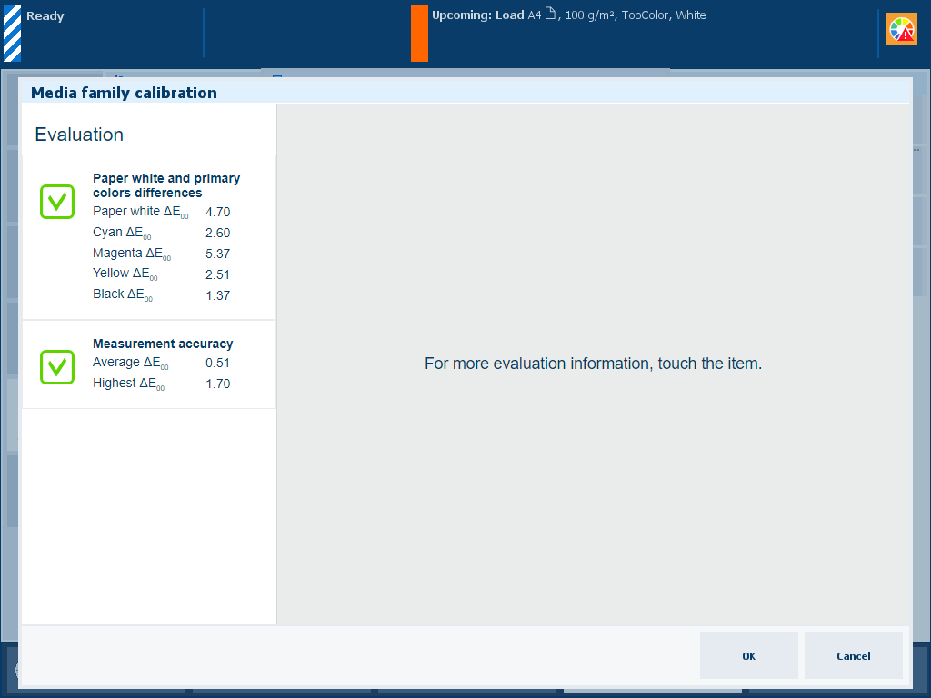 After media family calibration, the feedback window shows the results of the performed procedure.