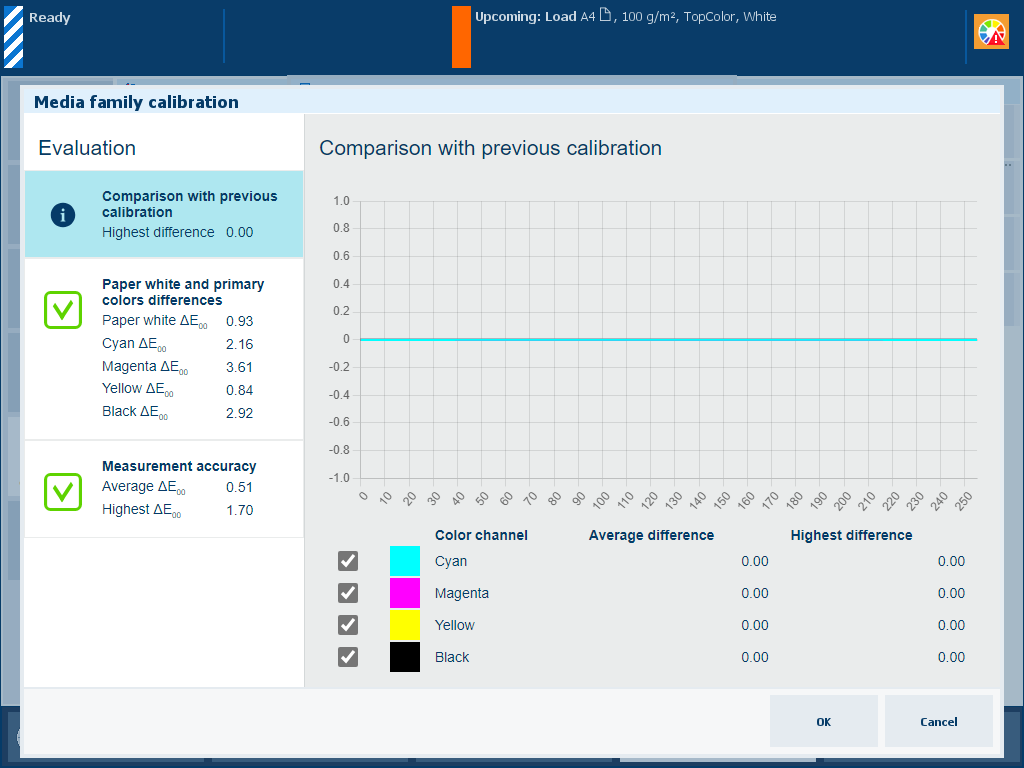 The CMYK lines in the graph show how many percent the colour differs compared to the previous media family calibration.