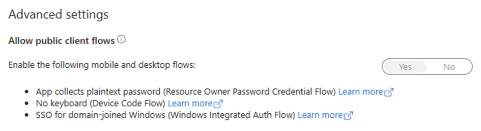 Aktivera [Allow public client flows] i [Avancerade inställningar]. Som standard är den här inställningen inaktiverad, men den krävs för att användarna ska kunna logga in på sina Microsoft 365-konton via den kod som anges på användarpanelen.