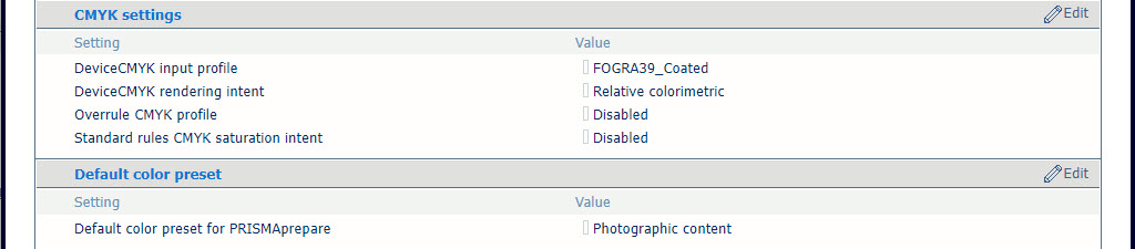 Aplikace Settings Editor uchovává vstupní profily DeviceCMYK, ze kterých můžete vybrat výchozí vstupní profil DeviceCMYK.