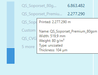 最も使用された用紙グラフにカーソルを合わせると、特定用紙の印刷量と、この用紙が他に使用している用紙に占める割合を確認できます。