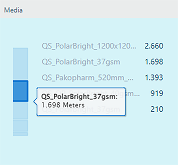 印刷メーター用紙名にカーソルを合わせると、用紙プロパティの詳細が表示されます。ここに示されている用紙プロパティは、デバイスごとに異なります。